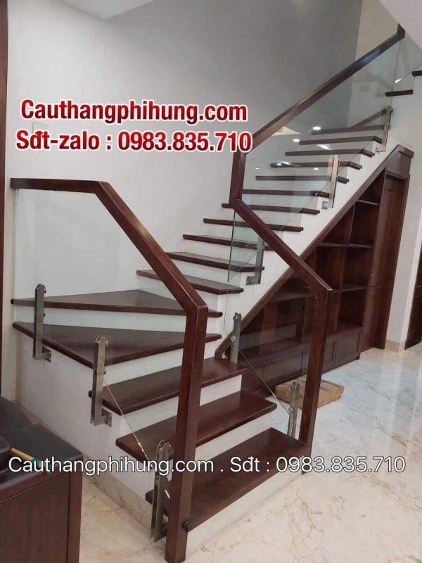 Cầu thang kính tay vịn gỗ mặt bậc gỗ Lim Nam Phi .